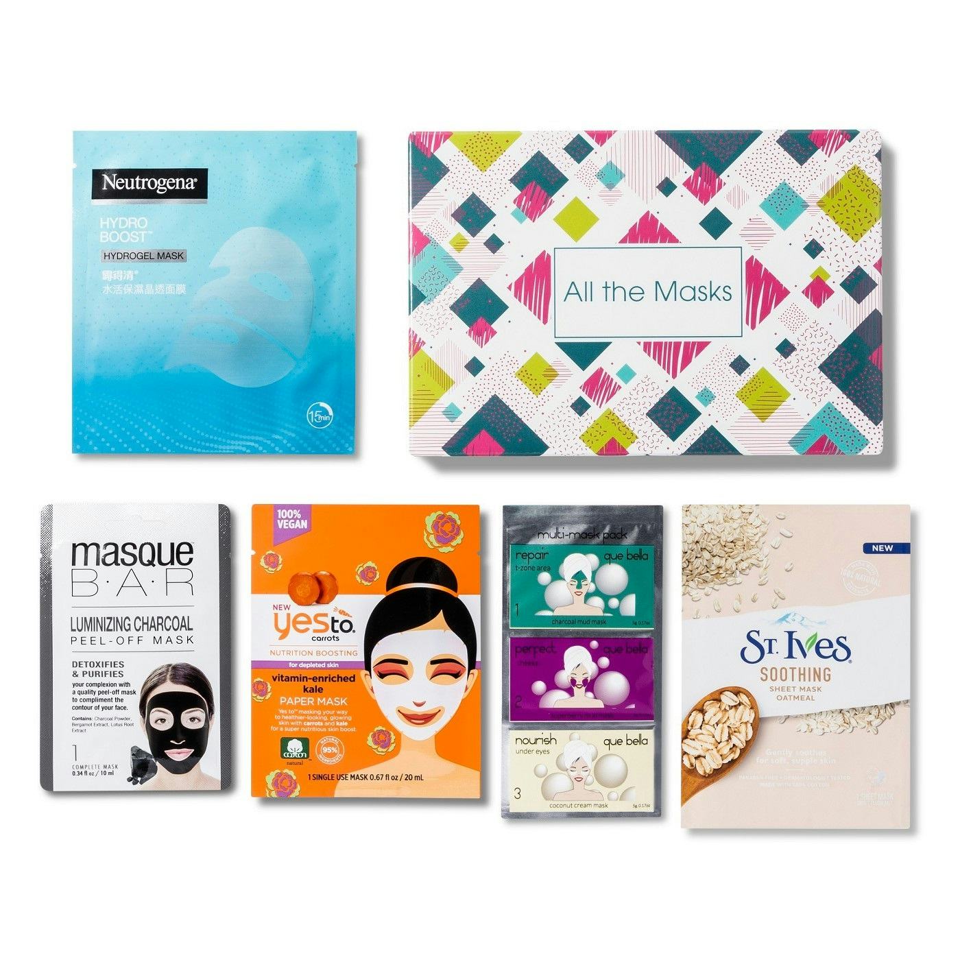Face mask lovers, this is the box for you. Featuring five items, in it you get the Neutrogena Hydro Boost Hydrating Gel Mask, which retails for $2.50 and brings you a hydrated, supple complexion; the Yes To Carrots and Kale Single Use Paper Mask, which retails for $2.50 and is a vitamin-heavy veggie mud mask that works on your glow; the Masque Bar and Luminizing Charcoal Peel Off Mask, which retails for $3.50 and detoxifies your skin with the power of charcoal; the St. Ives Soothing Oatmeal Sheet Mask, which retails for $2.50 and uses oatmeal to revive dull skin; and the Que Bella Multi Mask Trio, which retails for $3 and includes three different masks that attack acne, dull skin, and under eye problems. The box also comes with a $1 off coupon for St. Ives Facial Care.