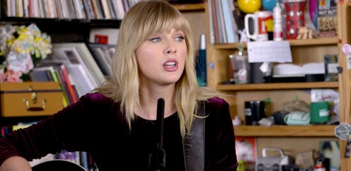 There's a common misconception that artists can't write great songs when they're happy in their personal life — even Taylor Swift, one of the most prolific songwriters of this generation. Luckily, Taylor Swift's "Death By A Thousand Cuts," off her most recent album Lover, proved that can still write great breakup songs even while she's very happy and in a relationship. And, as the singer confessed during her NPR Tiny Desk concert, posted on Wednesday, Oct. 16, she's pretty relieved.