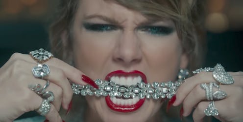 Taylor Swift shows off many different fashion and beauty looks in her blockbuster "Look What You Made Me Do" video — from an '80s level perm to a dominatrix-like outfit to a look that has her dripping with diamonds in a tub. Swift is also wearing lots of snake jewelry in the video, with both gold and silver adjustable snake rings available for $60 a piece through her webstore. She rocks a snake necklace and her strappy gold heels, worn while she is perched on her throne, drinking tea poured by a serpent.