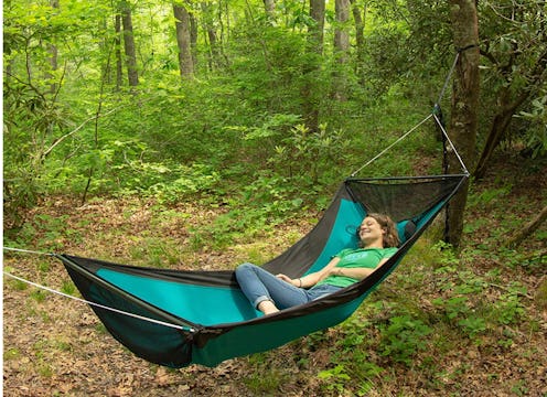 What's great about it: For folks who like to lounge together during their wilderness excursions, this double hammock is the perfect option for couples or besties. Unlike most hammocks that feature a three-panel design, this one is made from just two panels which makes it tougher and sturdier. Not only that, the reduction in stitching increases comfort too, and prevents it from sagging and stretching out over time. The breathable 75-denier polyester hammock weighs 1.8 pounds and can be packed down into a tiny ball and stored in its accompanying drawstring sack for easy portability. Plus, it comes with a set of straps with 18-inch daisy chains and two strong carabiners. As a bonus, the company makes specialized sleeping pads (which you can buy separately) that perfectly fit inside it.