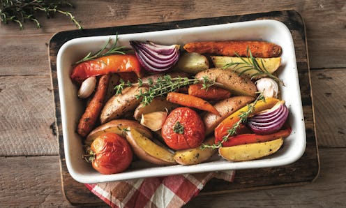 - Ceramic/stoneware: A true oven-to-table pan, ceramic bakeware is easy to clean and looks good on the table, too. Ceramic dishes also won’t react with ingredients, though the dishes themselves can chip. Since veggies need to be roasted at pretty high temperatures, many ceramic options won't be able to handle the heat, so look for ones capable of withstanding the temperatures you need (like the ceramic pick below, which comes with non-porous enamel finish).