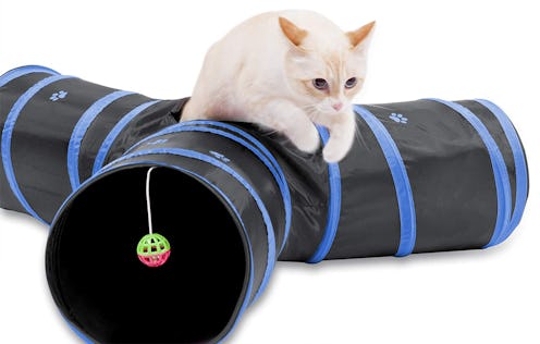This five-star-rated cat tunnel is one of the best picks if you're trying to encourage your cat to exercise while you're away. It includes three tunnels in one, so your kitty can basically stay entertained for hours. It also has a swinging bell toy, peephole, and tubes lined with crinkly material. Made from durable polyester, this washable tunnel also collapses completely, so if you're traveling, you can take it with you and still give your cat a way to play. Reviewers say this toy is especially good for cats that love to burrow or hide.