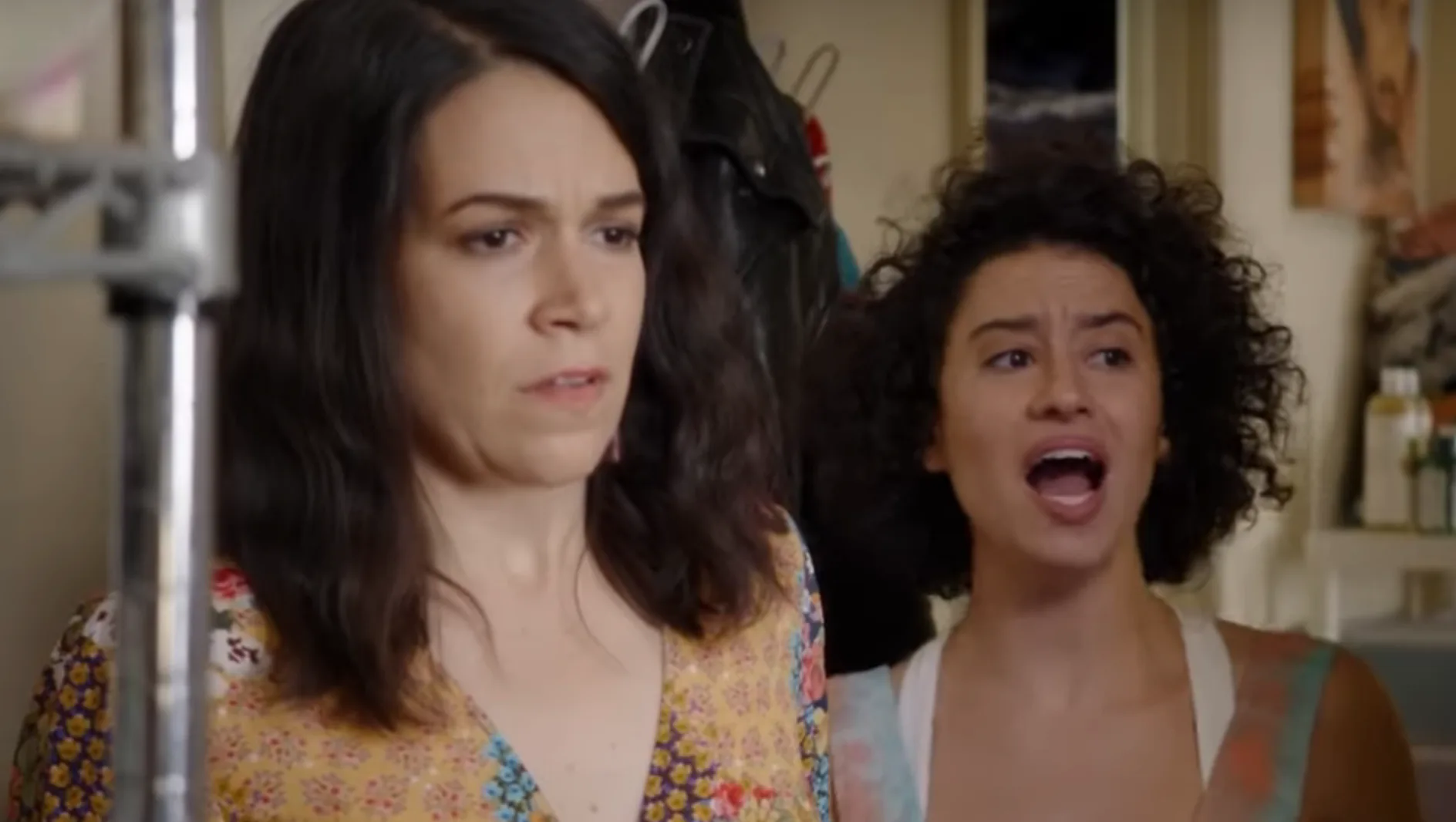 There's one clip where a leather-clad Ilana does a Matrix-style back-bend move. There's a moment where Ilana kisses Rachel Dratch. There's a scene where Abbi and Ilana — wearing nothing but bras and jeans — walk out of some dressing rooms, to which Ilana's mom (played by Susie Essman) gleefully tells a saleswoman, "Look what I brought you: fresh virgin breast-meat."