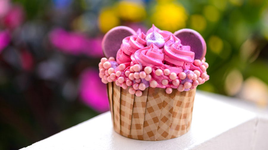 The third of the three Imagination Pink Cupcakes won’t hit the menu until June 30 — but in just a few days’ time, you’ll be able to give this one a taste for yourself. And, uh, folks? It sounds extremely extra. Its cake isn’t just vanilla; it’s vanilla confetti cake (which I’m assuming is Disney’s version of Funfetti). Its filling isn’t just raspberry; it’s raspberry cheesecake. Its frosting isn’t just raspberry buttercream; it’s two-tone raspberry buttercream. It’s also been topped off with pink crispy pearls and a pair of sparkly pink chocolate mouse ears. It is A Lot, and I am Here For It.