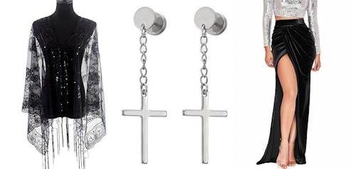 Noisy May Sheer Split Detail Maxi Dress, $23, ASOS; Biker Jacket, $19.99, H&M; Mandala Crafts Gothic Studded Choker, $9.99, Amazon; Circle Screw Earrings With Dangle Cross, $9.99, Amazon.