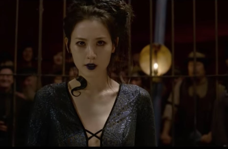 Mid-trailer, in one blink-and-you’ll-miss-it moment, the character Credence Barebone, played by actor Ezra Miller, whispers "Nagini" to a woman who then morphs into a snake. Played by South Korean actress Claudia Kim, Nagini is revealed to be a Maledictus, which Pottermore describes as “a carrier of a blood curse which will ultimately destine them to transform permanently into a beast.” J.K. Rowling, the series author, later clarified in a tweet that Maledictus are always women, carrying a blood curse from birth that daughters inherit from their mothers. While the character in the trailer can freely shift from human to snake, Nagini is destined to become trapped in her serpentine form.