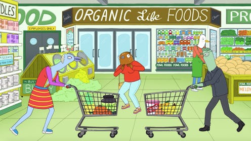 Tuca, on the other hand, needs sex bug medication and drags her best friend to the grocery store, which proves too overwhelming for the anxious bird to handle. The toucan leaves her best friend unattended in the grocery aisle while she applies the sex bug creams in the bathroom. Bertie proceeds to have a panic attack, which is portrayed through song. While she explains that she's "losing her sh*t for so many reasons," the other shoppers double as a skeptical Greek chorus, returning that she actually has "no reason" to freak out like she is.