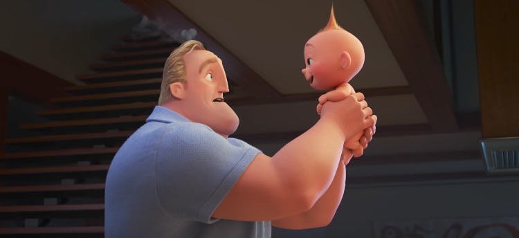 The Incredibles 2 will pick up where The Incredibles left off more than 13 years prior. However, it's now Mr. Incredible's turn to stay at home with the family, while mom Elastigirl will take the spotlight. This transition strains the family, as Mr. Incredible must "navigate the day-to-day heroics of normal life," according to a press release, while Elastigirl adjusts to her role as family provider. Plus, they have three kids: Moody teen Violet is back, the maniacal Dash is still zooming around, and then there's baby Jack-Jack to contend with. By the end of the first Incredibles film, audiences knew something that the Parr family didn't — that the baby has powers, perhaps stronger and greater in number than anyone else in the family. As evidenced by the trailer, it's only a matter of time before Mr. Incredible finds out that his youngest is just like him. No chance that will go poorly.