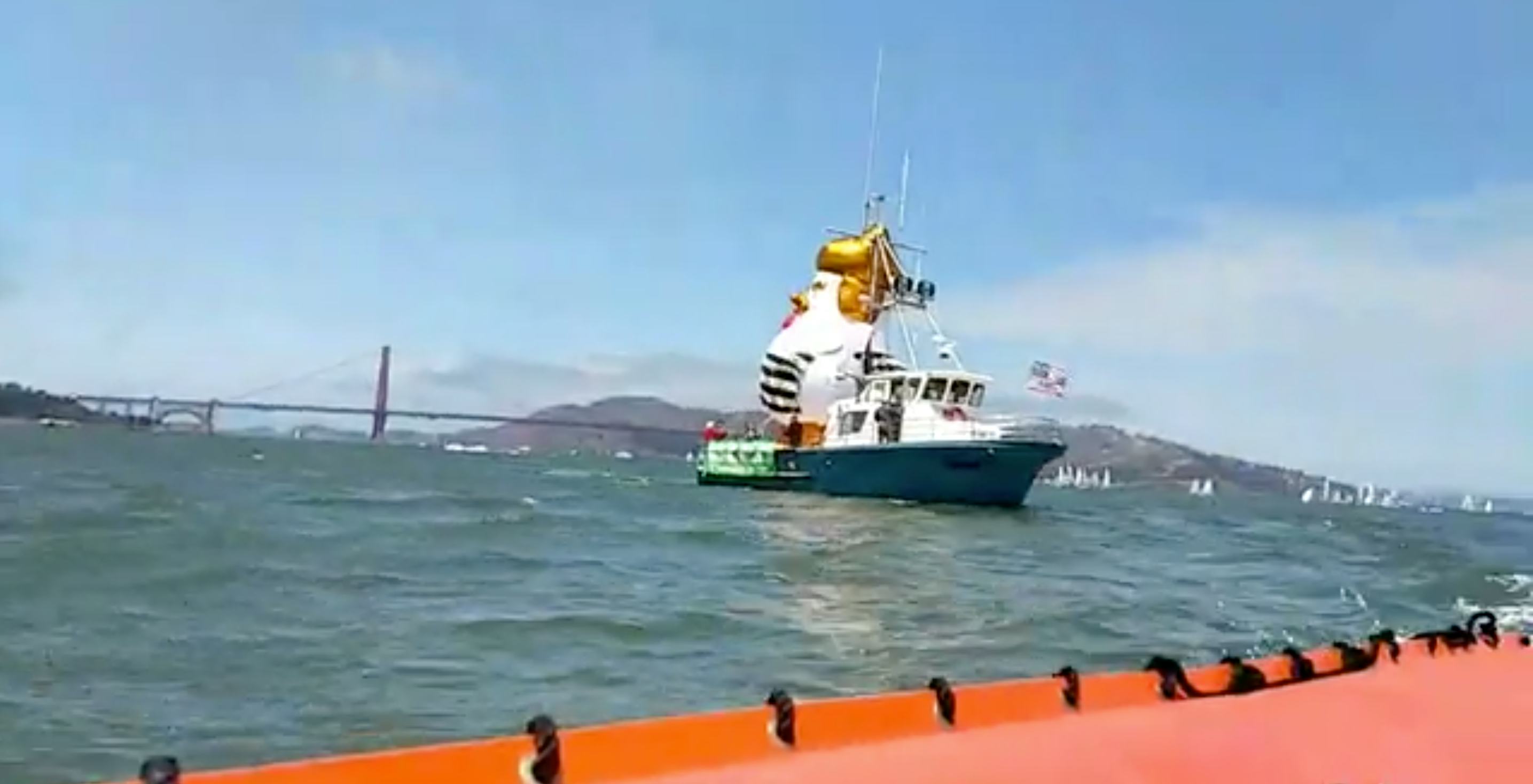 There was a test run on Saturday, when the balloon — dressed in black and white stripes — circled Alcatraz, or "the Big Coop" as organizers call it. "After the week the world has had, we all want to see Trump in jail," the organizers wrote on their GoFundMe page. "Yet we know the wait is long, too long. In the meantime, how can we let out our frustration about everything that seems so ruined and wrong?"