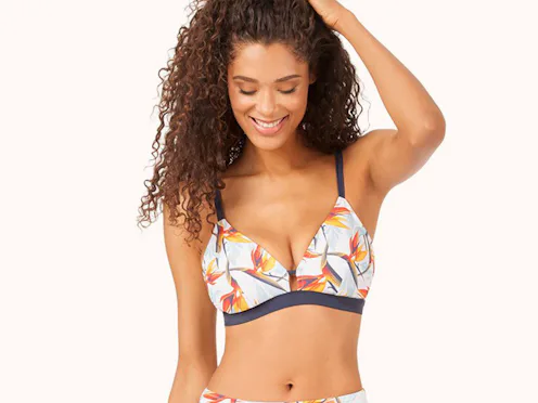 The waterproof version of the Busty will include all the same supportive features as the bralette, plus some bonuses that are optimized for swim. The same wide, adjustable straps and wide band are there, plus the cups are lightly lined with removable padding. It'll come in four classic colors (black, navy/white, white, and tomato red) plus a chic-yet-fun bird of paradise floral print.