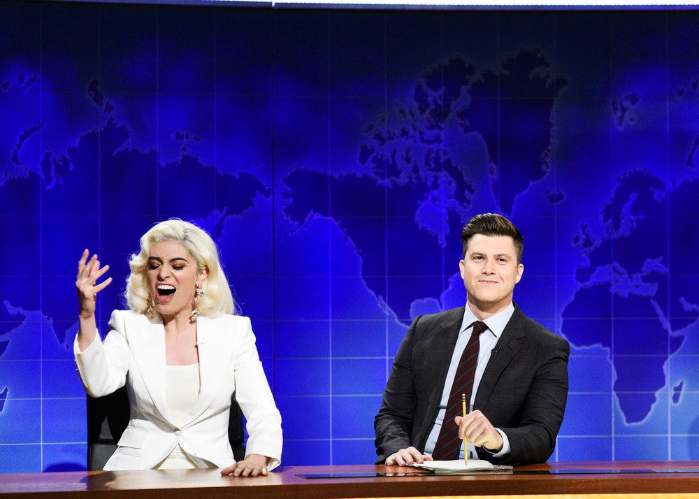 Previously, Villaseñor's Gaga impression was kind of a meta joke on Update. She came out to talk to Colin Jost and Michael Che about the Grammy awards as Melissa, unabashedly dressed as Lady Gaga, and did an impression of "Shallow" from A Star Is Born — which she claimed to have just discovered. Jost implied that she had been trying to get her Lady Gaga impression on the show, and was trying to sneak it in. This time, she's just playing Gaga from the get-go. She got her wish!