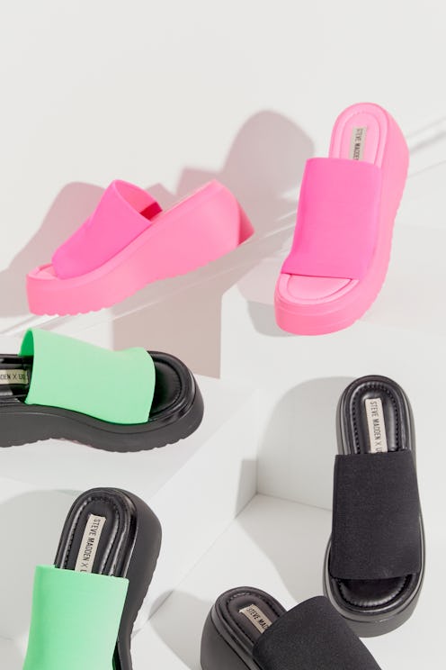 Think back to a time when thick sandals were a thing on style icons like Lizzie McGuire (along with the animated version of the character). The stretchy styled shoe was a staple, and Steve Madden is bringing it back in a plethora of colors to Urban Outfitters. Creating the design with a more modern twist, the shoes are offered in black, pink, and lime green for the spring.