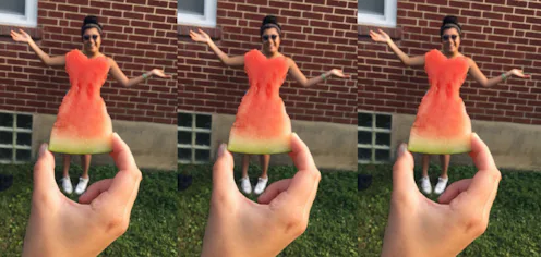The idea behind the trend is pretty easy: You take a watermelon slice and fashion it into a dress silhouette, then place it over your subject (with them in the background,) making them look like they're wearing the frock. But before you think it's just as easy as strategically chomping on the slice a few times to make an archaic-looking skirt, it's a lot more creative than that (though the nibbling works, too — there's no wrong way to do it!) People have created all sorts of shapes and styles, getting elaborate with their looks. "Some cut their bright pink fruit into the silhouette of a trendy frock, others simply stick to the classic triangle shape. Others have personalized their watermelon apparel with sweetheart necklines and ballet tutus, and a few fashionistas have opted for watermelon shift dresses and even jumpsuits," Allure reported. You can get as elaborate as you want.