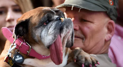 Zsa Zsa is a senior English Bulldog from Anoka, Minnesota, according to CNN. Her muzzle is grey, her eyes are clouded with cataracts, her legs are bowed, and her enormous tongue (too big to fit comfortably in her mouth) hangs to the side like a piece of soft, pink statement jewelry. She also has a underbite, appearing more defined by the pup's set of yellowing, crooked teeth.