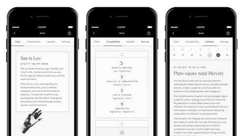 Guler explains that Co-Star solves two problems for astrology aficionados. By using an app, you don't have to shell out big bucks for a personal visit to an astrologer, and it goes beyond the free predictions you can get online — many of which only use your sun sign, which doesn't give you a complete picture. By leaving out key information like your Venus, predictions about your love life are meaningless, Guler says. "Co—Star brings the full, personalized experience of visiting a professional astrologer to your phone — for free."