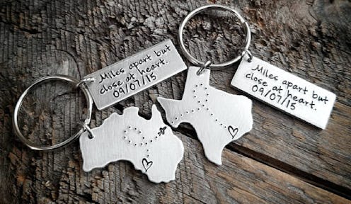 These keychains are custom made by artisan TheLonelyMoose, who, according to his profile, specializes in "creat[ing] custom made personalized hand stamped keepsakes and uniquely crafted jewelry with a minimalistic style." Each comes with a state-shaped charm embellished with a dotted line and heart, and an accompanying metal tag that reads "Miles apart but close at heart" (or whatever else you'd like it to read — it's customizable). One state is engraved with an image of an airplane.