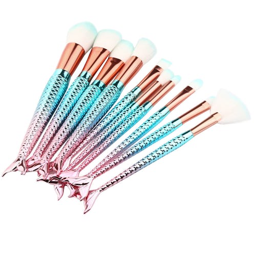 The 10-piece set, which will eclipse any boring, black-handled brushes on the market, costs $45. So they shake out to less than $5 per tool. The brushes are cruelty-free and vegan, in addition to having the coolest tails.