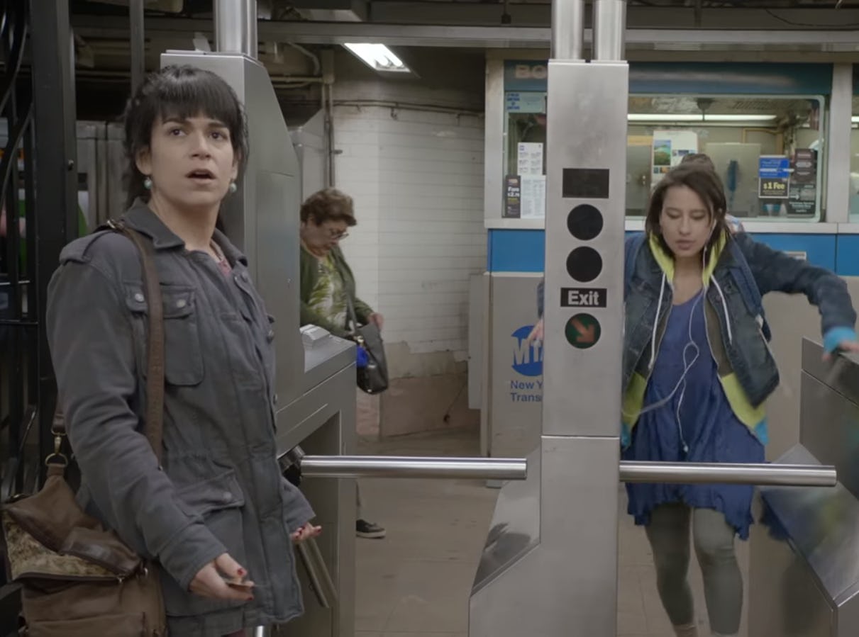 Abbi and Ilana are returning to Comedy Central to cheer the world up with a new episodes of Broad City this September. But before the show gets down to its usual shenanigans, the Season 4 premiere may give fans a peak at a world where New York City's best BFFs never become friends. The heartbreak is real, guys. The Broad City Season 4 premiere is titled "Sliding Doors," and a new clip from the episode hints at a world where Abbi and Ilana are just two cool ladies passing in a subway station.