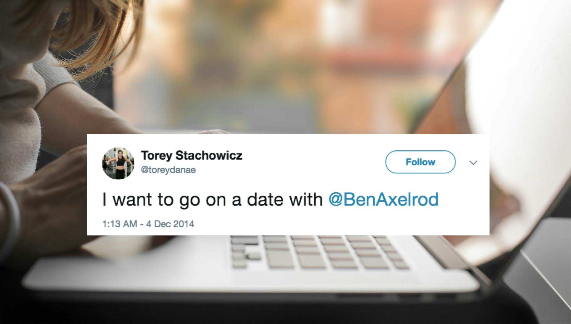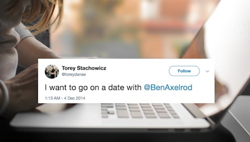As Mashable reports, it all started in 2014, when Torey Stachowicz, a personal trainer in Cleveland, Ohio, tweeted that she wanted to go on a date with Ben Axelrod, a local sportswriter. It was a fairly brave move, considering she sent her request out to the world and didn't contain it in a private direct message, like I do with all my Twitter crushes (just kidding, I don't actually send any messages, I just fave all their tweets, I have no spine!). But Stachowicz's gambit worked, or at least it piqed Axelrod's interest in a potential free drink — he tweeted back, "you buying?" The rest, it seems, is Internet Dating history: