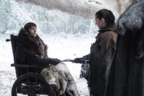 On Sunday night's Game of Thrones, a lot happened that might have distracted from a smaller moment earlier in the episode. Littlefinger's gift (and attempt to bribe) Bran on Game of Thrones went sour for a few reasons — not that I expected much more from a scene between the two creepiest men in Winterfell, but still. The Three-Eyed Raven is as uninterested in mysterious weapons as he is in hugging, being human, having emotions, and pretty much anything else. That's disappointing, because Bran likely has some useful information about that dagger's history. And, that encyclopedic knowledge could turn up information that the dagger is connected to the Night King on Game of Thrones.