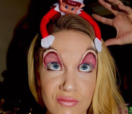 When you think of holiday makeup, chances are you think of glitter eyelids, flashing red lips, and deep plum or raspberry shades. It's not often that you think of peeled back eyelids, stretched out jaws, and hair on fire. But with makeup artist @Zoe-artistsharvest's Elf on the Shelf makeup looks, that's exactly what you get.