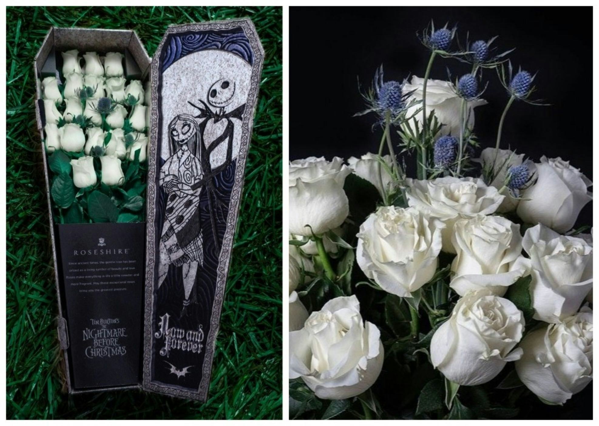 If the idea of a dozen red roses arranged in a bland but tasteful glass vase and accompanied by a sprig of baby’s breath doesn’t quite do it for you, good news: You can get a Nightmare Before Christmas rose bouquet instead. Made by upscale flower arrangement and delivery company Roseshire, the bouquet features not baby’s breath, but a thistle — and even better, it’s presented in not in a bland but tasteful glass vase, but in a box that looks like an actual coffin.