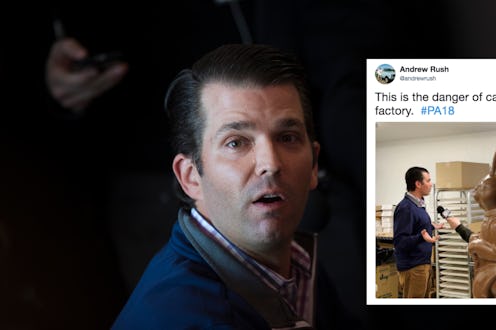 On Monday, Trump Jr. was in Pennsylvania campaigning for Republican House candidate Rick Saccone. The president's son was visiting the state's Sarris Candies, a sweets-manufacturing factory, along with aspiring candidate. Both political figures reportedly talked to factory workers, wore hairnets, took selfies with the people inside the factory, and tried out the sweets. The venue and company, according to ThinkProgress, is owned by avid Trump fans who let Trump Jr. and Saccone in for a campaigning tour.