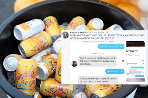 They say it’s a small world, and perhaps you’ve had six-degrees-of-separation experiences, too. For instance, dating-wise, maybe you and a friend match with the same person on Tinder … and OkCupid … and Bumble. Or you befriend someone at a party, only to realize you have more than 50 mutual friends on Facebook. How did you not know each other before?! Well, on December 17 via Tinder, Emily, 18, matched and messaged with a guy, Drew, 19, who’d just found a case of LaCroix on the sidewalk — and also matched and messaged with the guy, Raymond, 20, whose “drinks” had just been taken off the sidewalk. So, yes, within about a half-hour, she matched with the LaCroix thief and the LaCroix victim.