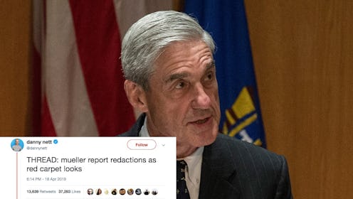 There's not a lot of humor in the news lately but, thankfully, Twitter can help fix that. On Thursday, a Twitter thread of Mueller report redactions as red carpet dresses basically took over the internet. The thread has essentially gone viral now, and it's not hard to see why. It's internet gold, and for politically savvy fashion fans, it may be the best thing you see all day.