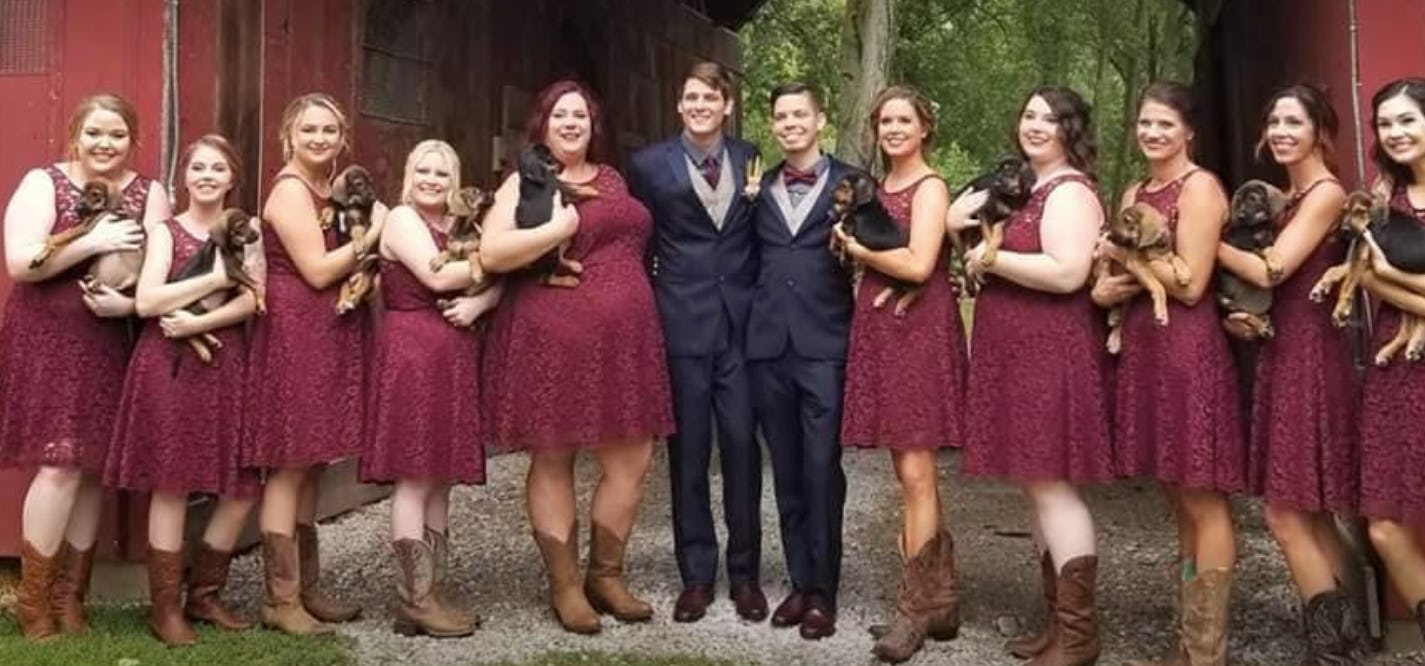 During their Sept. 8 wedding in Collinsville, Illinois, Kyle Morris and Brian Seals decided to forego the traditional floral accessories for something a little more fluffy, according to the Wichita Eagle. Instead of having their wedding party carry bouquets, each of the ten bridesmaids carried a puppy from Partner 4 Pets, an animal shelter at which both grooms worked when they became engaged last summer. The couple told the Wichita Eagle reports they knew they had to incorporate animals into their big day before any other detail had been planned. And truthfully, what could possibly be a better accessory for a rustic-casual maroon bridesmaid ensemble than a wiggly little pup?