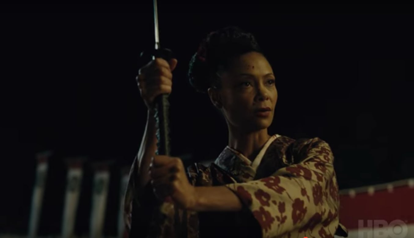 The preview for the episode, titled "A New World," opens with Maeve, dressed in a kimono, telling a woman (presumably a host) in another language: "I was plagued by a voice saying, it said, 'This is a new world. And in this world, you can be whatever you want to be.'" Viewers then get a glimpse of this whole new world, including a ceremony with hosts (including Maeve) on their knees and surrounded by pits of fire, a woman dancing in Asian garb, and the Samurai army.