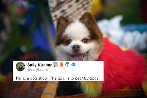 "Folks are encouraged to walk around and familiarize themselves with the breeds, and petting is very, very encouraged," Kuchar told Mashable. That was an encouragement that she took very, very seriously. She decided that she would make it her own person journey to put not just a few dogs, not just many dogs, but 100 dogs. And she documented the whole thing on Twitter and Instagram, where people were obsessed not just with her determination, but the range of furry friends who she made at the dog show. From big and hairy to little and yipping, there was definitely something for everyone. Some dogs were really into getting a little love and attention from Kuchar, while others could not have given any fewer effs about the petting or challenge at hand. Still she persisted.