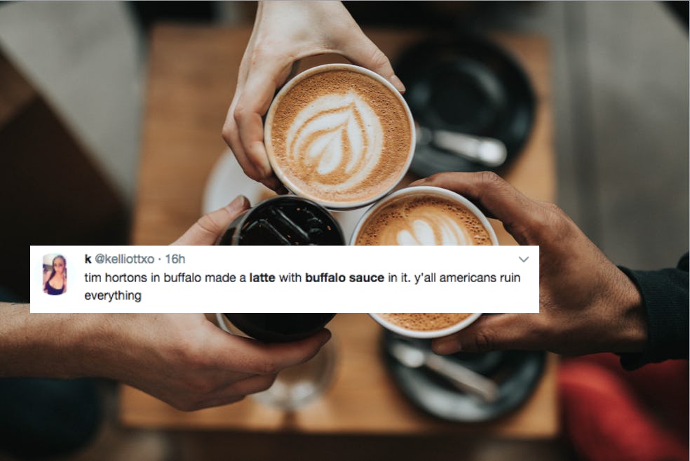 There are some things that just shouldn't go together, like peanut butter and pickles, or like Buffalo sauce and coffee. However, that didn't stop Tim Hortons from debuting its new Buffalo Sauce latte at the restaurant's Buffalo, NY, locations. Made from freshly brewed espresso, steamed milk, mocha, and bold Buffalo sauce flavor, the latte is topped with whipped topping and a dusting of zesty Buffalo seasoning," a press release from Tim Hortons said of the beverage. That's right, Buffalo sauce lattes are real and not a prank, and based on the reactions posted to Twitter from the brave souls who tried this ill-conceived beverage, many people wish they weren't. "