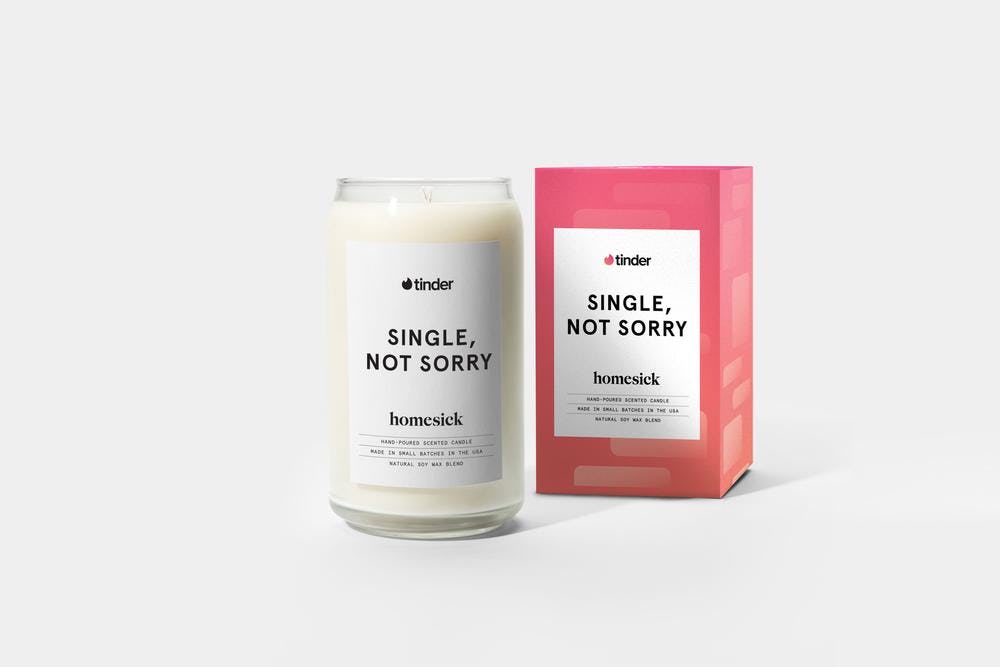 What's the best way to show your independence this Valentine's Day? You can hang out with your closest friends, you can drink all of the fizzy wine in the land, you can ignore it completely — or you can take a classy approach as a young, sophisticated woman loving her single life. Tinder has teamed up with Homesick Candles for a total FU to Valentine's Day culture — the "Single, Not Sorry" candle. You may remember Homesick Candles from their state-by-state options, designed to make you feel every so nostalgic every time you light it up, but this is a slightly different vibe. The candle is arriving just in time for Singles' Awareness Day, which falls on February 15th.