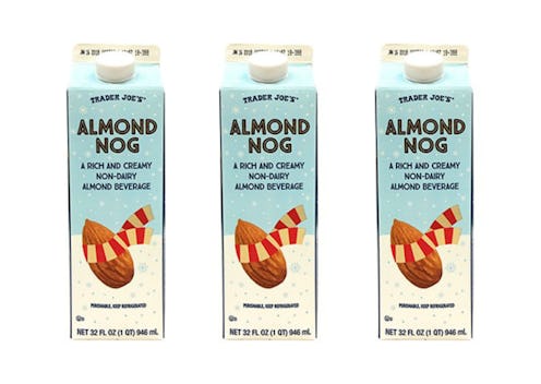 Trader Joe's beloved Almond Nog originally launched last holiday season, so people are thrilled to see that it's officially back on shelves for a mighty return. Instagram user Erika, who runs @the_bizerkeley_vegan, seems to be the first to have shared the exciting news of the nog's re-emergence. The account shared a photo of the beverage on Nov. 12, announcing that the drink had officially arrived at Trader Joe's stores. The vegan food account is apparently based out of the greater San Francisco Bay Area, so it's safe to say that our Nor Cal friends can officially get their vegan nog on starting now. As for everyone else, keep your eyes peeled during your next TJ's run (if you don't get too distracted by all the other vegan holiday goodies at Trader Joe's), because the drink is likely to hit shelves nationwide once again.