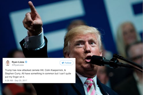 The common racial background of each individual was obvious to many reacting to Trump's Saturday morning rescinding-invitation tweet. Journalist for New Yorker, Ryan Lizza, tweeted, "Trump has now attacked Jemele Hill, Colin Kaepernick, and Stephen Curry. All have something in common but I can’t quite put my finger on it."