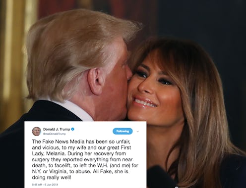 But according to Trump, there's no truth behind any of those stories. "All Fake," he tweeted, adding that "she is doing really well!" Trump went on to accuse multiple reporters of not only seeing Melania in person, but seeing a visibly happy Melania — and failing to report on it.
