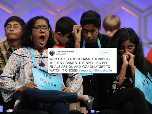 "WHO CARES ABOUT GAME 1 TONIGHT?" yet another spelling bee fan exclaimed. "THERES [sic] 7 GAMES. THE SPELLING BEE FINALS ARE ON AND YOU ONLY GET TO WATCH IT ONCE!!!! #ImportantThingsInLife."