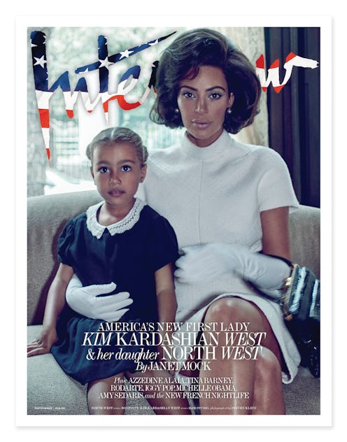 On Monday, Aug. 28, Interview Magazine released the cover of West posing with her daughter, North, channeling Jackie O in her iconic white dress. She sits on a cream couch in a navy and white dress with North by her side. West also dons white gloves, giving off major '60s Americana vibes. The magazine's title, Interview, is printed at the top in a red, white, and blue font, complete with white stars.