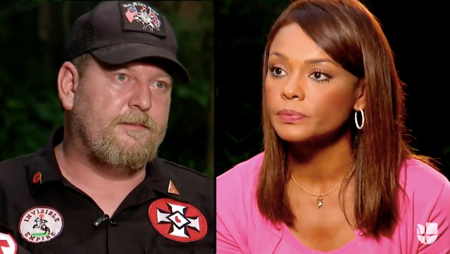 The issue of media interaction with white supremacists is complex. Sending a white or non-multiracial interviewer might have led Univision to be accused of pandering to Barker in order to make him more "comfortable." And confrontation with his worst nightmare — an articulate, confident, professional, Black and Latina female immigrant — definitely created conditions for Barker to be violently truthful about his beliefs (though one can argue that somebody who identifies publicly as a KKK Imperial Dragon doesn't need to be prodded to reveal their beliefs). But while watching the footage, it's important to remember why Calderón isn't obligated to put her own safety on the line to delve into violent hate for us all to see.