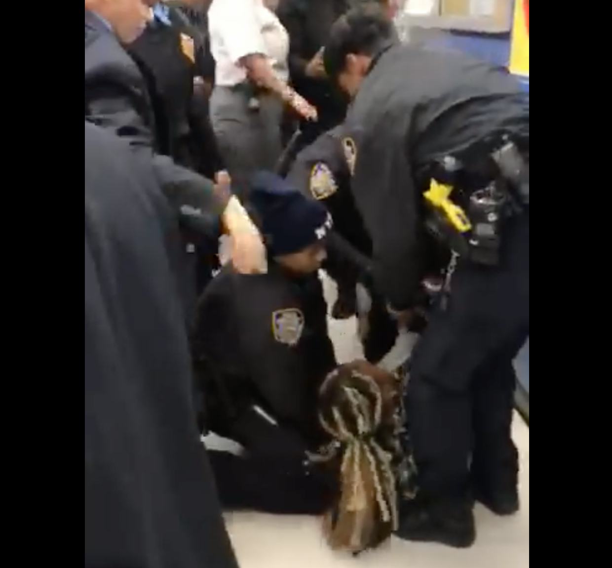 When Headley refused to stand back up, more security was brought in and NYPD was called. While it's unclear exactly how Headley's confrontation with the responding NYPD officers began, video of the encounter shows at least four officers grappling with her and her child as they attempt to arrest her. At one point, one officer repeatedly yanks on the child as onlookers scream in apparent shock and outrage. A few seconds later that same officer can be seen pulling out a yellow stun gun and pointing it first at the gathering crowd and then at Headley.