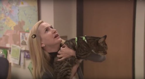 The fire drill cold open is The Office at its best, with many of the characters being their most quintessential selves in response to the (fake) fire created by Dwight. Michael repeatedly screams "Stay calm!" to the room, Andy ask-yells why the fire is shooting at them, Kevin smashes the nearest vending machine open instead of an exit door, and Angela attempts to rescue a pet cat that she's been hiding in one of the office drawers. All the while, as the situation escalates, Dwight militantly quizzes the crew on fire drill safety procedures.