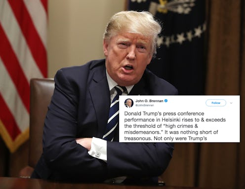 Brennan tweeted on July 16, "Donald Trump’s press conference performance in Helsinki rises to & exceeds the threshold of 'high crimes & misdemeanors.' It was nothing short of treasonous. Not only were Trump’s comments imbecilic, he is wholly in the pocket of Putin. Republican Patriots: Where are you???"
