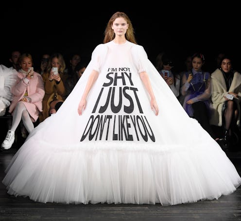 On one of the most frank dresses that was sent down the runway is straight out of your favorite meme page on Instagram. "I'm not shy, I just don't like you" is better off read than said out loud. But if you are so bold, then go on with your bad self, girl.