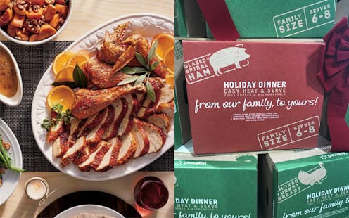 The Thanksgiving kits, which are available in-store, come in two options: brown sugar glazed boneless spiral ham and smoked boneless turkey breast. Both meal kits come with the same accoutrements: homestyle gravy, creamy mashed potatoes, traditional stuffing, green bean casserole, and mac and cheese. What kind of stuffing is "traditional" exactly? Some of us like cornbread. And what type of mac and cheese is it? Stovetop or baked? These are important questions, but it seems that those interested will have to open the mystery box to find out.