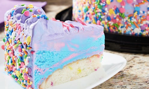 Just in case this wasn't already appealing to every glittery ventricle in your millennial heart, the ice cream cake isn't just an ice cream cake — it also has a layer of confetti cake. And that ice cream isn't just ice cream — it's cake batter-flavored ice cream. I might actually be crying sparkly unicorn tears. The cake, which is sold in Walmart locations under the Marketside brand, is on the smaller side — it says it has 12 servings, but I'd guesstimate you'd get away with six to eight — but costs a mere $14.98, which is less than the price of three Unicorn Frappuccinos (a fact I've retained in my head for this long because most of what I eat is either unicorn-themed or cheese.