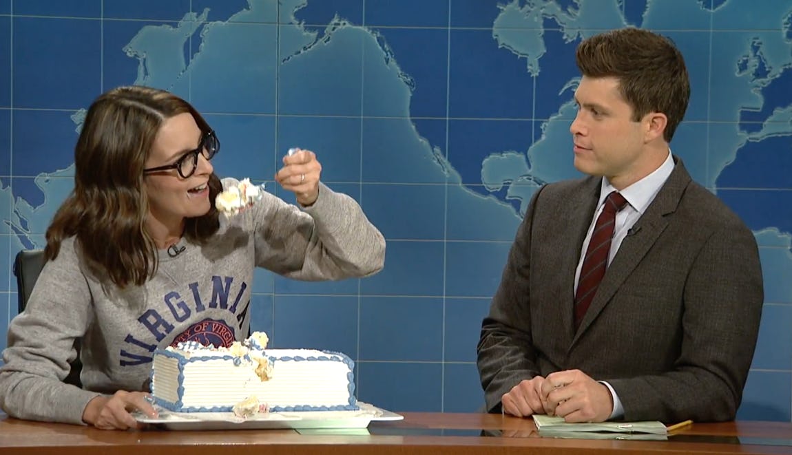 The best part about the segment is that during that little monologue, Fey actually pulled a giant cake with an American flag out from under the desk, and then began to eat it. And I mean really eat it, the way you never allow yourself to dig into a cake. When Weekend Update host Colin Jost asked her how that was supposed to help, it all became clear. If there's something you want to go out and scream at the polo shirt-wearing guys with automatic weapons, Fey said, "Don't yell it at the Klan, Colin, yell it into the cake!"