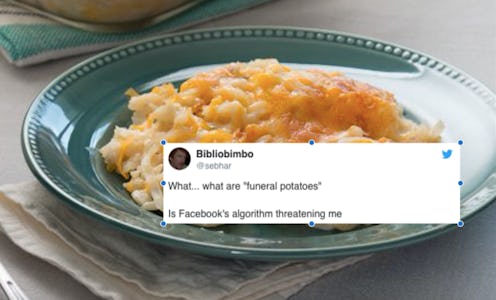 We all know that clever marketing trick where whatever you were last shopping for online immediately ends up as ads on your Facebook page. (In other words, be careful what you shop for.) But in a delicious and yet traumatizing turn of events, Facebook is advertising "funeral potatoes" sold by Walmart to confused but hopefully hungry users, Today reports. It sounds morbid, and we're all, "Who died?" but funeral potatoes are surprisingly amazing.