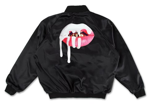 The black satin Kylie Cosmetics "Lips" bomber jacket is back and will go on sale at the digital The Kylie Shop on Tuesday, Feb. 14. But the black satin version is just one of three bombers that Kylie Jenner is now offering in her merch shop. The Kylie Shop sells Jenner-branded merch, featuring her own likeness, that of her family in the form of a white t-shirt boasting an illustrated version of her mother, momager, and family matriarch Kris Jenner giving the finger, and other elements of her overall brand, like Kylie Cosmetics. There is a new "season" of merch available via The Kylie Shop on Valentine's Day, including two more bombers! What colors are the new Kylie Jenner satin bombers, which feature the dripping lips logo of her cosmetics company on the back?