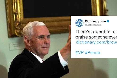 If there's any warning sign for a politician, it's when the dictionary starts dunking on you. That's a lesson that Vice President Mike Pence learned all too well on Thursday, less than 24 hours after a downright gushy meeting with President Trump following the passage of the Republican tax bill. After remarks in which Pence praised Trump once every 12 seconds, according to The Washington Post, an online dictionary decided to clue everyone in to exactly what they witnessed. Dictionary.com trolled Pence, with the word "sycophant" getting a shout-out on its Twitter account.